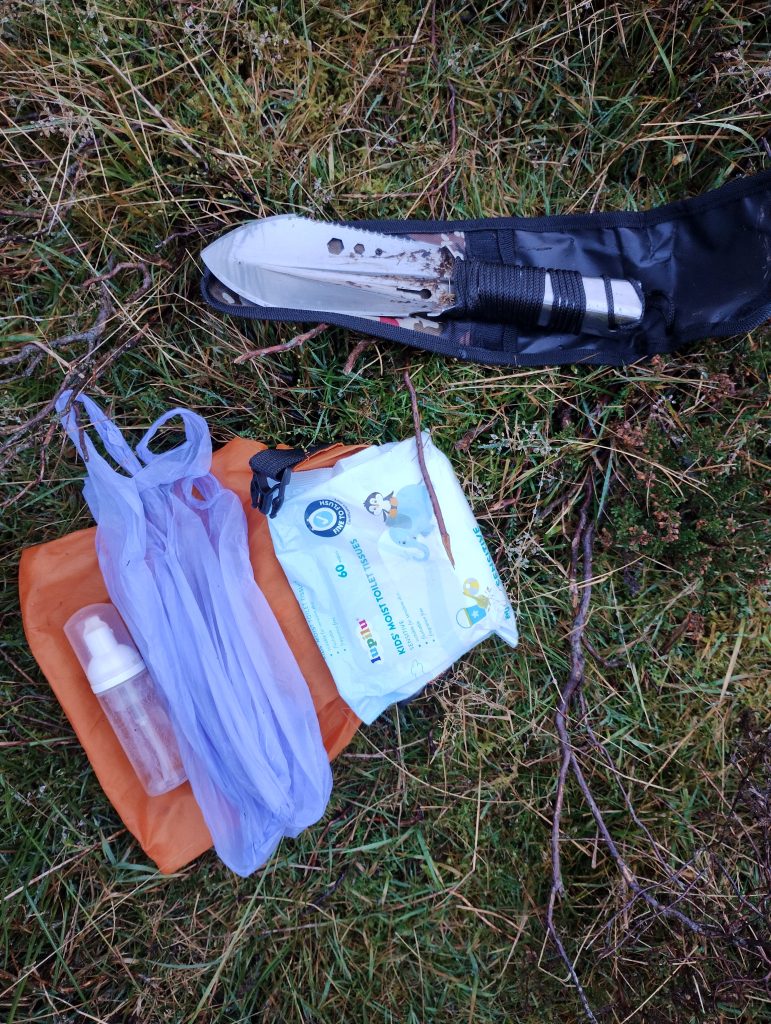 Mine consists of a trowel to dig a small hole, wet wipes, small plastic bags for the used wipes (I use plastic nappy sacks), hand sanitiser, and a small dry sack/bag to keep it all together.