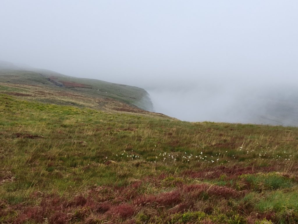 What this meant was that as we made our way along the ridge we were being constantly hit on our left hand side by the cloud laden wind that made our left side damp but left the right side dry, an interesting feeling for sure. However, unperturbed by the conditions we were making good time as we walked north along the path that ran very close to the edge on occasions.