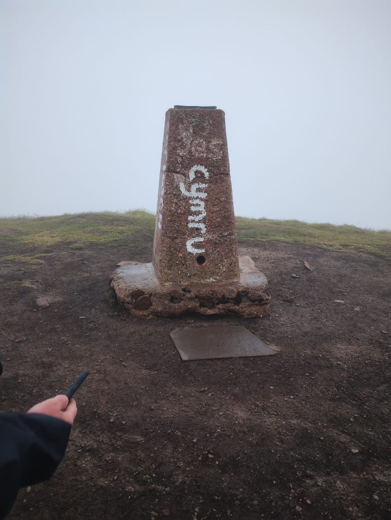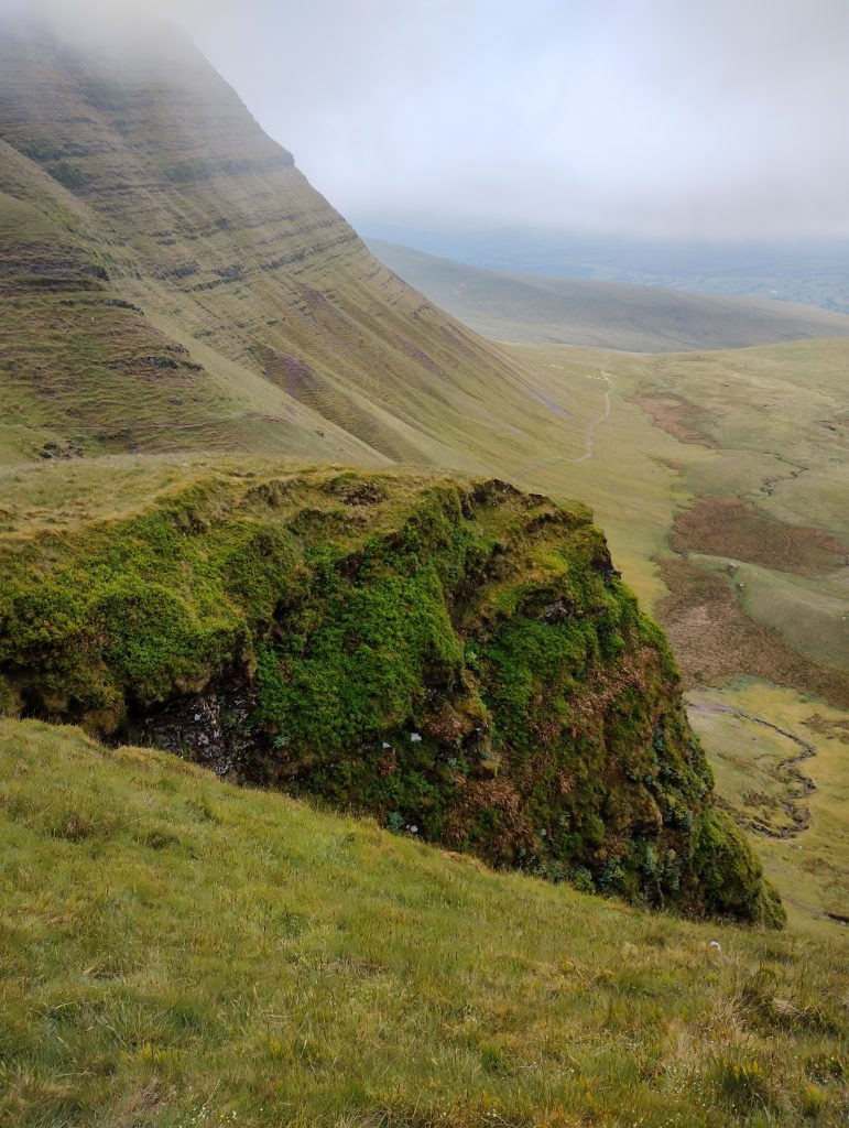 It continued on this way for a while until we got to the trig point on Fan Brechyniog where we took the obligatory selfie and then carried on towards the end of the straight section where we had to turn left before sweeping back round clockwise and dropping down towards Llyn Y Fan Fach. However, before we did that there were one or two very quick breaks in the cloud where we were teased with what we would have seen on a clearer day. One of the reasons for doing this particular walk was to capture the unbroken views across Brecon that are available from the top of the escarpment. Unfortunately, the cloud put paid to that, but we did get a few glimpses where the cloud parted briefly at which point the phones came out toot sweet and we got as many pics as we could.