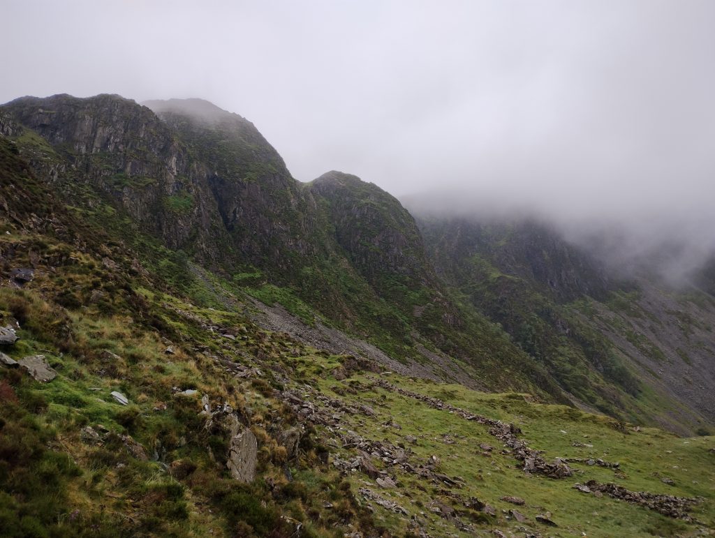 However, it was at one of these scrambles that we hit a point at which we could not justifiably go any further. It was a moment of disappointment for sure, but most definitely the right decision. The scramble at this point was either over the top which meant climbing up high sections of rock face with a definite drop either side, or a very narrow ledge slightly lower down that needed you to cling tightly to the rock face. Either way was going to need a lot of effort and concentration, but in low visibility and what was becoming increasingly slippery rock surface because of the wet from the cloud, plus the heavy packs we were carrying, meant that on this occasion it was simply just too dangerous to continue any further.